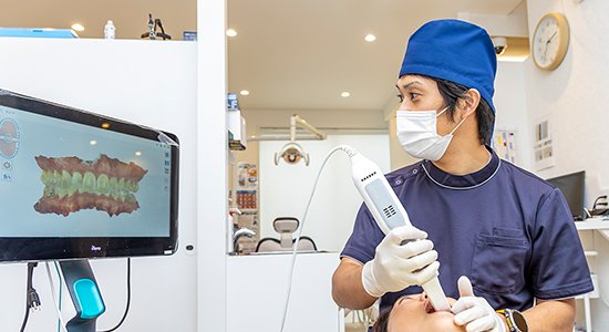 iTeroという口腔内スキャナーを用いて、お口の中をスキャンし、モニター上に立体的な歯並びの画像を表示します。(ご予約状況によっては、iTeroを使用できない場合がございますので、ご了承ください。)
